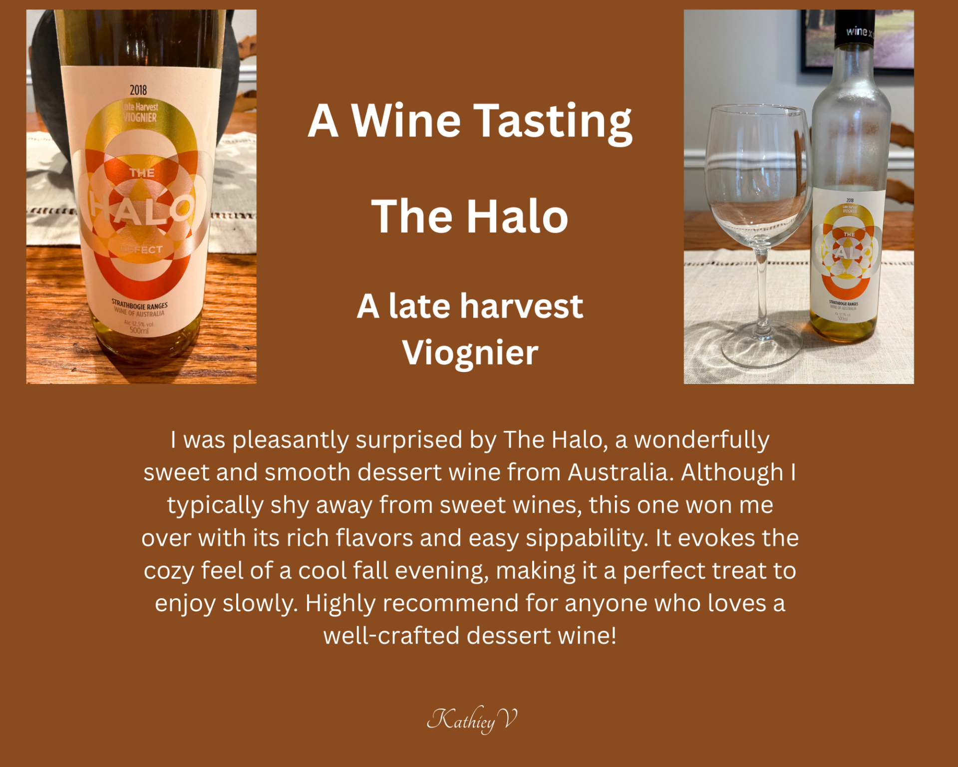 My take on the wine: Visually, it’s a light gold, resembling filtered apple juice—clear, bright, and clean with no sediment. The legs, or tears, flow slowly down the glass. The scent is fruity, reminiscent of apple cider, which carries through to the taste. True to its character, The Halo is very sweet and could easily be enjoyed as a dessert wine.